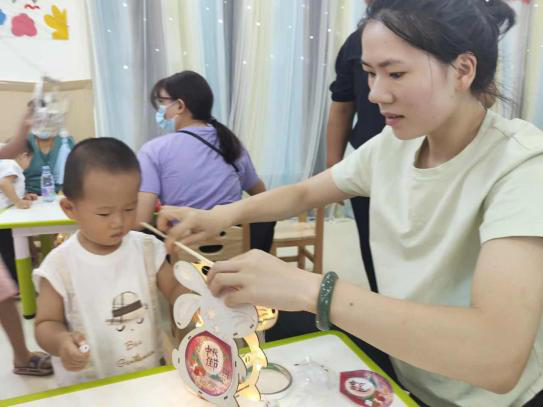 每个家庭利用手上的材料,进行拆分、设计、粘贴等步骤,不一会儿,就看到大家手上的灯笼逐渐成型,灯笼架上了小白兔、小花、叶片等。在志愿者们的协助下,粘上灯和安装把手后,小朋友按下按钮,灯笼瞬间亮起,只见小朋友“哇”的一声,现场节日氛围扑面而来。