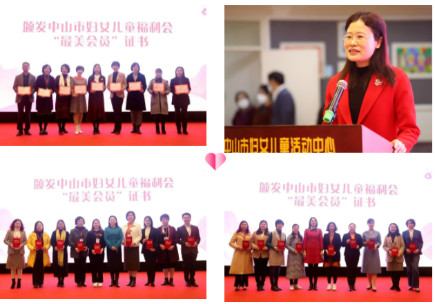 市妇联副主席高峥详细介绍了中山市妇女儿童领域的慈善公益项目,希望得到全社会的大力支持,让更多的困境家庭得到帮扶,营造行善为乐的社会风气。近50位热心慈善事业的会员被评为“最美会员”,颁奖典礼上,市妇联二级调研员刘浴平,副主席夏晓霞、贺铁斌,为阳艳峰、黄海英等“最美会员”代表颁发证书。