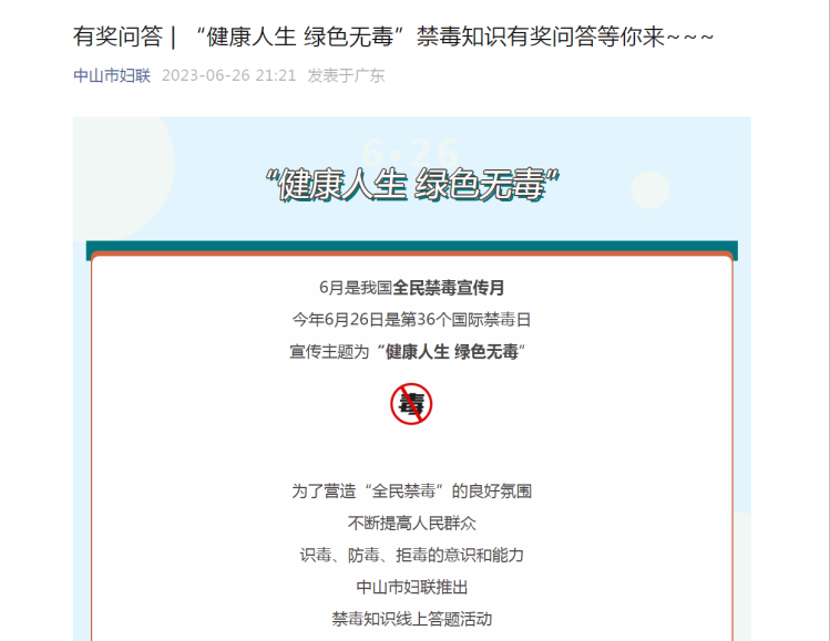 各级妇联广泛开展主题鲜明、富有成效的宣传教育活动。中山港街道妇联巾帼志愿者联动禁毒社工开展“全民共创无毒火炬”“6.26”国际禁毒日邀您来打卡宣传活动;石岐街道妇联开展“护航儿童,禁毒同行”禁毒宣传教育进校园活动;南朗街道妇联在“同心圆”便民服务集市现场以“普法+心理”形式为妇女儿童讲解吸毒危害,引导妇女群众远离毒品、珍爱生命;小榄镇妇联以讲座宣传、有奖问答等形式面向辖区中小学、幼儿园学生开展禁毒专题宣传。