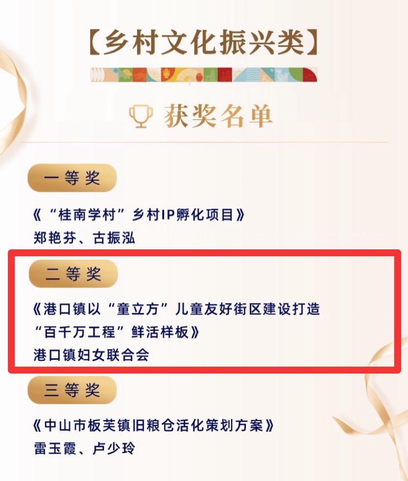 近日,在中共中山市委宣传部、中山市文化广电旅游局、中山市文学艺术界联合会、广东中山文旅集团有限公司联合举办中山市“百千万”文化能人擂台赛中,港口镇以“童立方”儿童友好街区建设案例荣获中山市“百千万”文化能人擂台赛乡村文化振兴类二等奖。这标志着我镇在深入实施“百千万工程”、推动乡村文化振兴与城市更新融合发展中取得扎实成效。