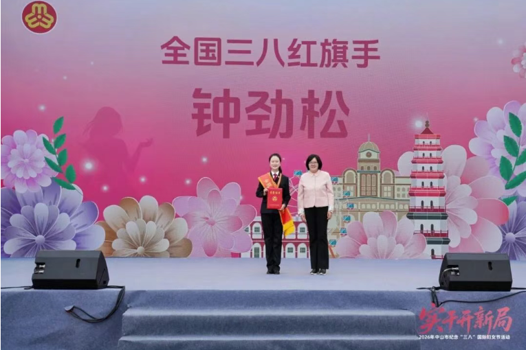 在随后的全国先进典型颁奖仪式上,胡梯为荣获2025年度全国三八红旗手的市中级人民法院民事审判第一庭副庭长钟劲松颁奖;赵东航为荣获2025年度全国巾帼文明岗的中山港海关“青篱”国门生物安全研究小组颁奖。