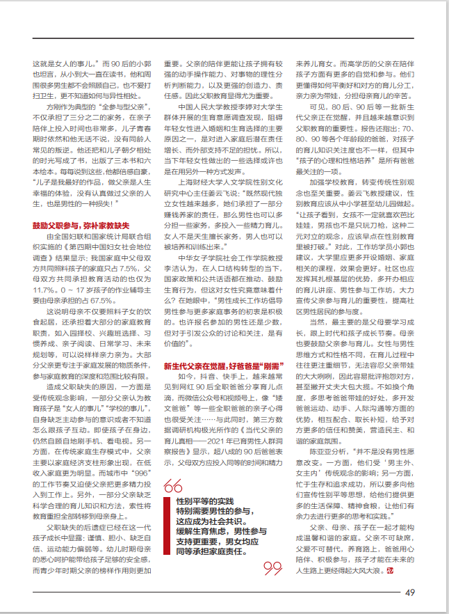 怀胎十月虽然辛苦但还算短暂,之后养育子女、承担家务,则需要男性付出更多、改变更多,做一名好父亲、好伴侣任重道远。