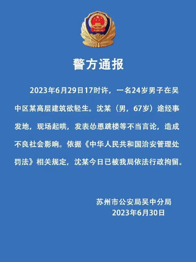 2023年6月29日17时许,一名24岁男子在吴中区某高层建筑欲轻生。沈某(男,67岁)途经事发地,现场起哄,发表怂恿跳楼等不当言论,造成不良社会影响。依据《中华人民共和国治安管理处罚法》相关规定,沈某今日已被我局依法行政拘留。